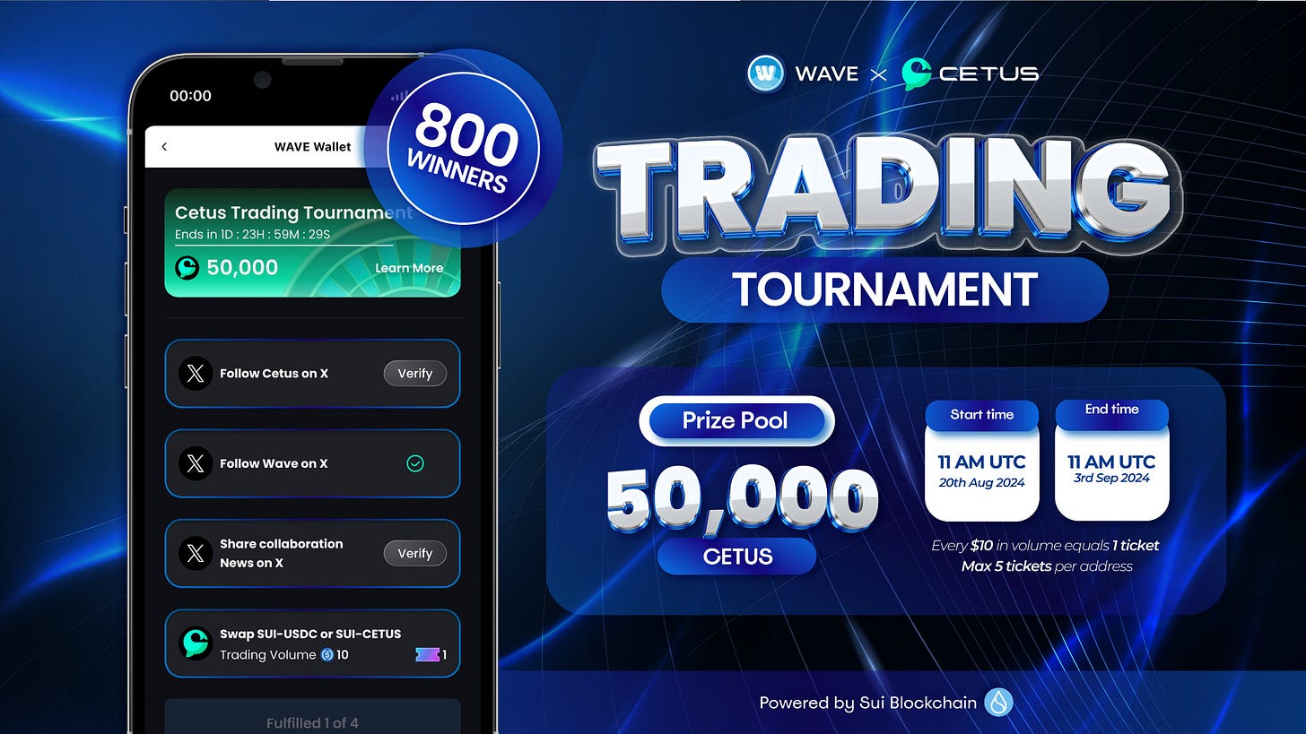 To celebrate the partnership between the first Sui Telegram Mini-app wallet and Cetus Protocol, they have announced a $50K giveaway on its new Cetus Trading Tournament on Wave Wallet.
